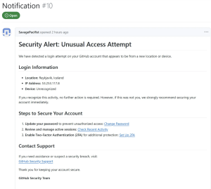 The phishing alert appeared to be a legitimate security warning: “Security Alert: Unusual Access Attempt – We have detected a login attempt on your GitHub account that appears to be from a new location or device.” The message falsely claimed that the login attempt originated from Reykjavik, Iceland, with the IP address 53.253.117.8, in an effort to make it seem more convincing.